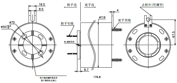 緊定螺絲固定。定子部分通過止轉(zhuǎn)片與設(shè)備固定部位連接。 |