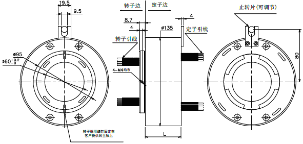 緊定螺絲固定。定子部分通過止轉(zhuǎn)片與設備固定部位連接。 |